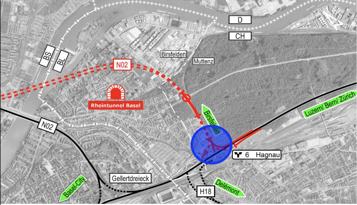 Situation Rhine tunnel Basel, overpass of the port railroad at the Hagnau branch (blue circle)