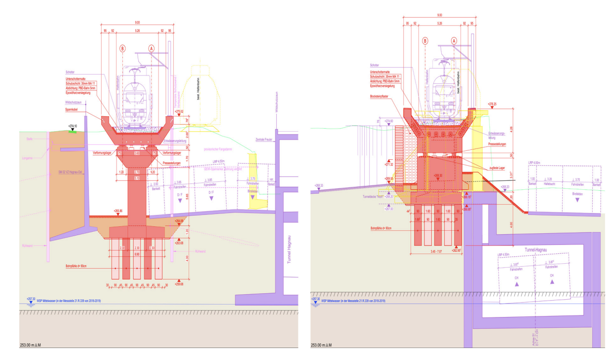 Since 2018, Rapp AG has been working with ALLPLAN software; for example, when designing the overpass of the port railroad. This is a threespan bridge of around 80 meters in length with a trough cross-section prestressed in the longitudinal direction. In plan view, the structure crosses the new roadway in the direction of the Rhine tunnel in a very circular manner. Adjacent to it are retaining walls with complex geometric shapes. The overpass is founded on drilled piles, the construction of which is anything but simple, as Florian Burk, project engineer at Rapp, explains. “Some of the substructures are being built directly next to an operating rail line within an excavation pit that is about 10 meters deep. In the construction sequence, the new bridge slab will be built next to the operating rail bridge and moved to its final position with a transverse thrust during a four-month closure of rail operations,” he says.